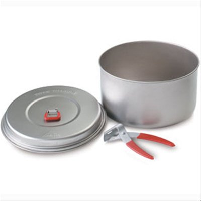This titanium wonder shaves half the weight from similarly sized stainless steel 2-liter pots. Completely compatible with MSR's Heat Exchanger, the 2-liter pot includes a snug fitting lid that doubles as a plate, a LiteLifter and reusable stuff sack.